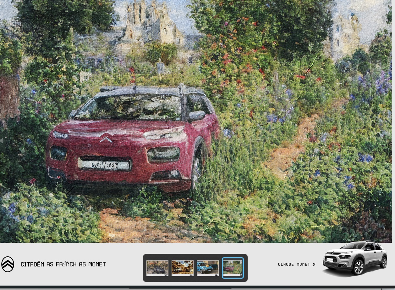 Para ayudar a resolver este problema y aprovechando la popularidad de la obra de los artistas franceses más emblemáticos de la historia, nace La Re-Conexión Francesa: utilizando AI y con los modelos más famosos de Citroën como protagonistas, la campaña revive el arte de Paul Gauguin, Claude Monet, Eugene Delacroix, Paul Cézanne y Édouard Manet.